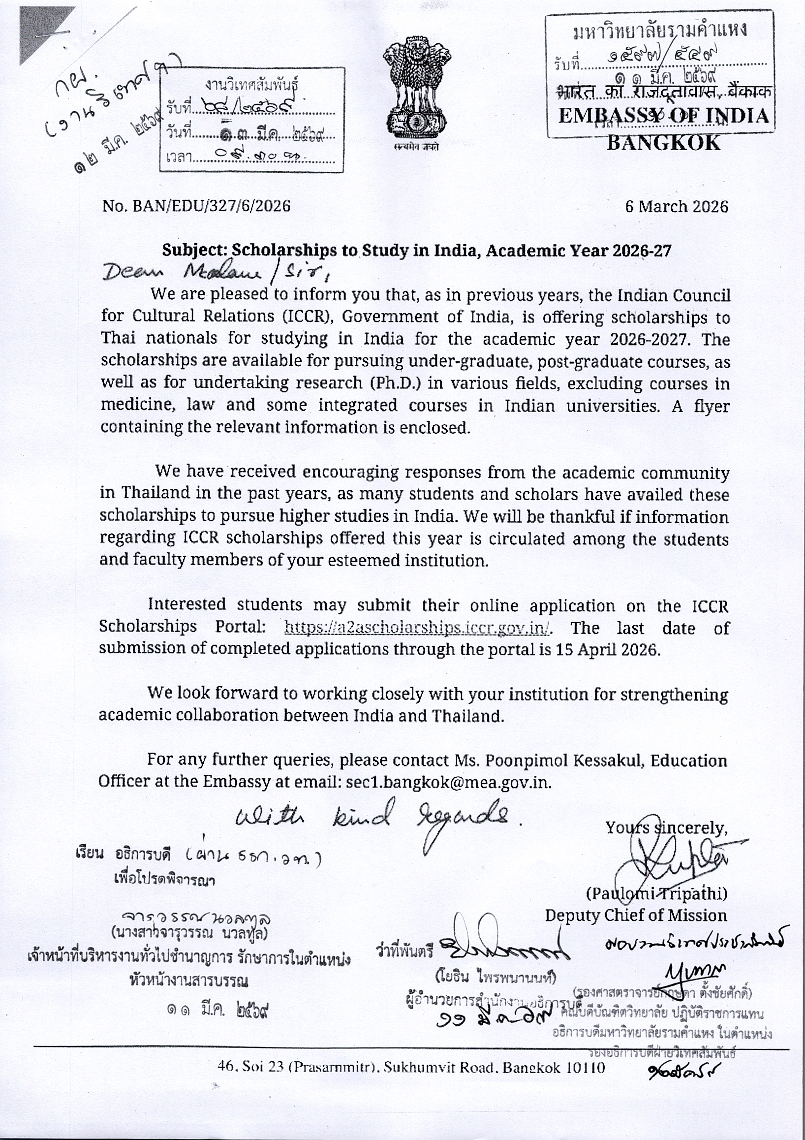 ประชาสัมพันธ์ทุนการศึกษาเพื่อการศึกษาต่อในสาธารณรัฐอินเดีย 2026-2027
