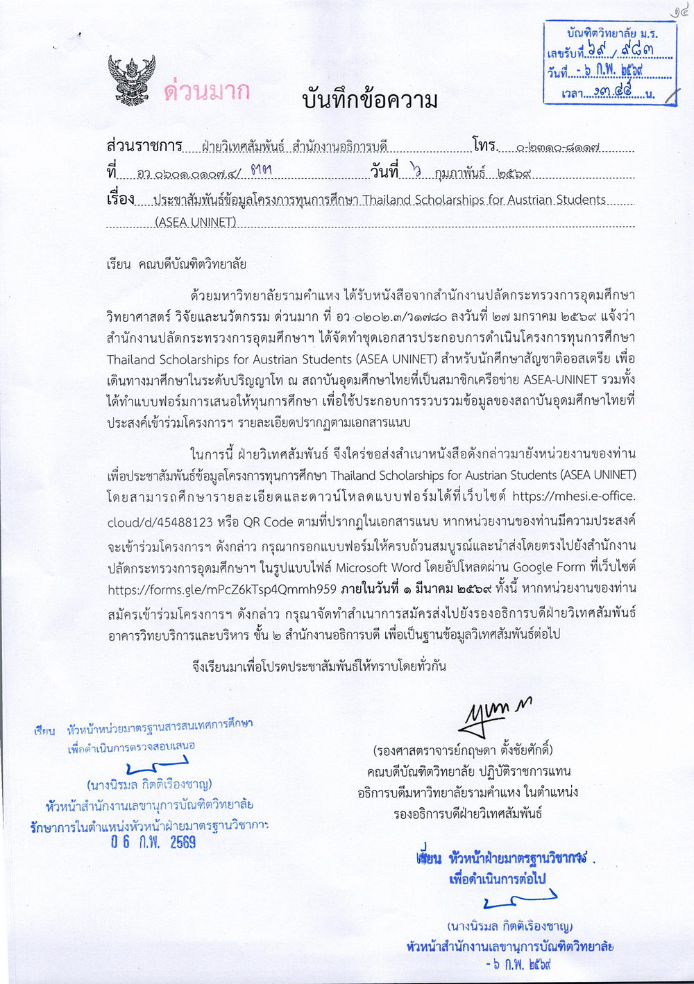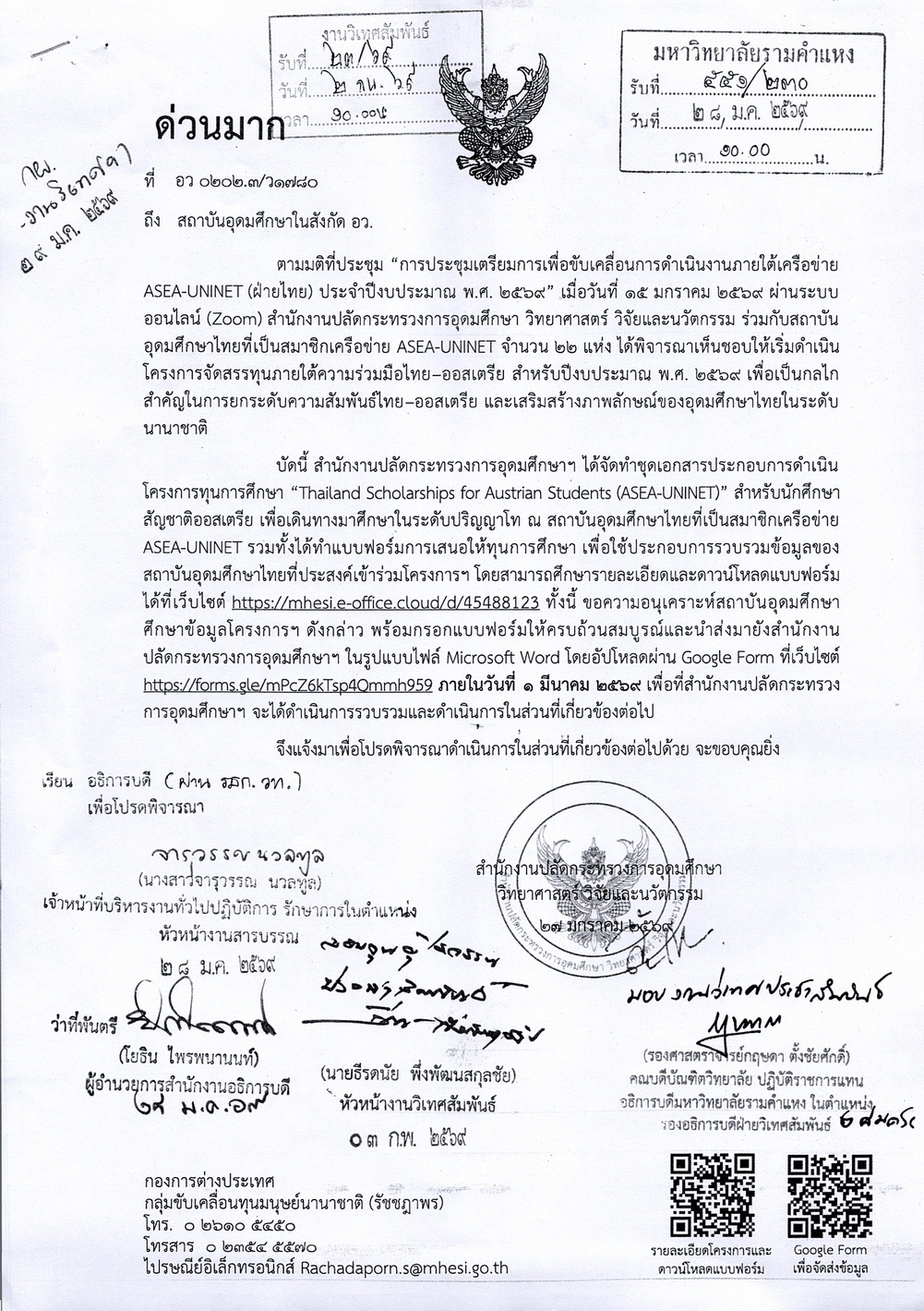 ประชาสัมพันธ์ข้อมูลโครงการทุนการศึกษา Thailand Scholarships for Austrian Students (ASEA UNINET) 2569