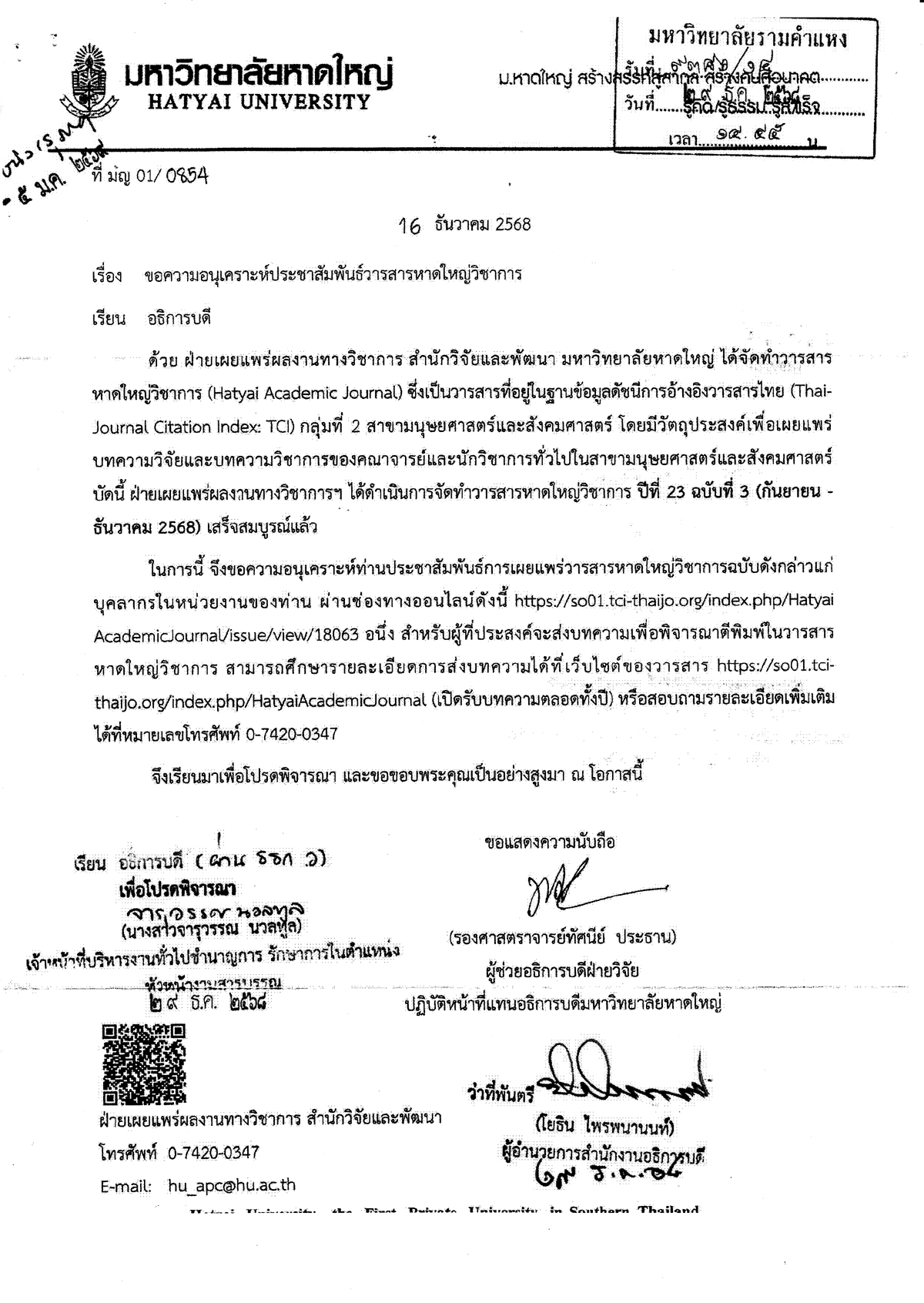 มหาวิทยาลัยหาดใหญ่ขอความอนุเคราะห์ประชาสัมพันธ์วารสารหาดใหญ่วิชาการ