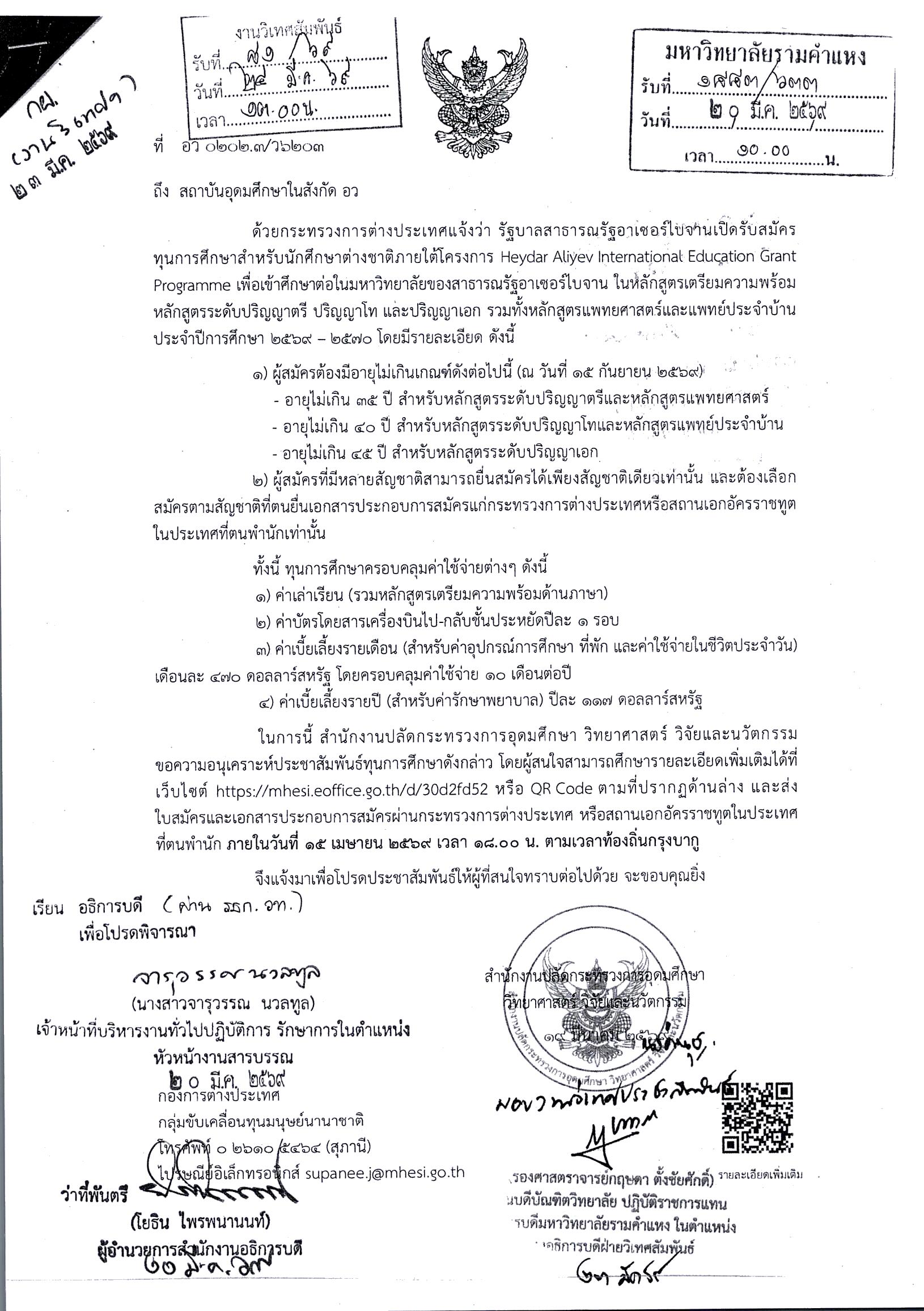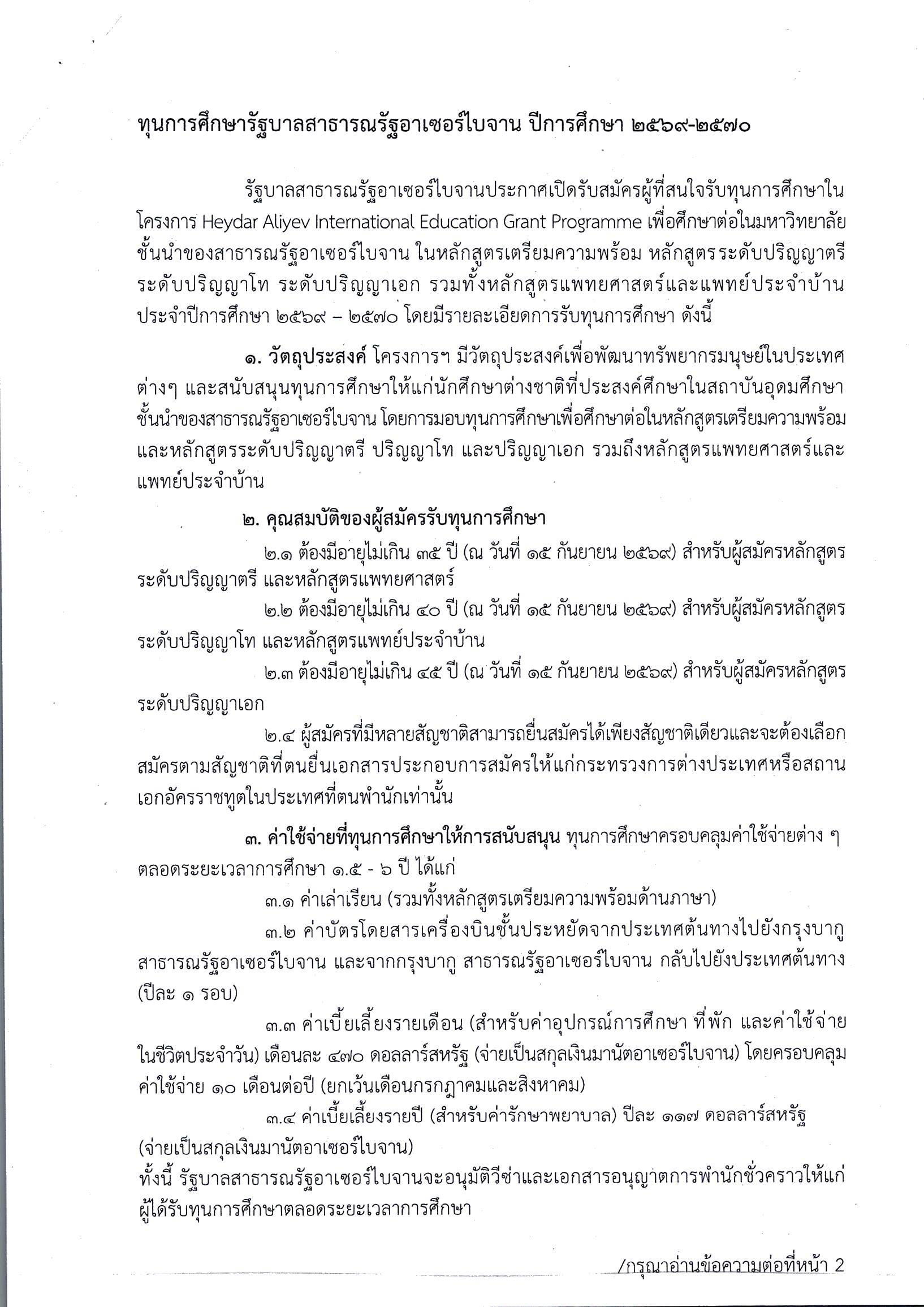 ประชาสัมพันธ์ทุนการศึกษาจากรัฐบาลสาธารณรัฐฐอาเซอร์ไบจาน