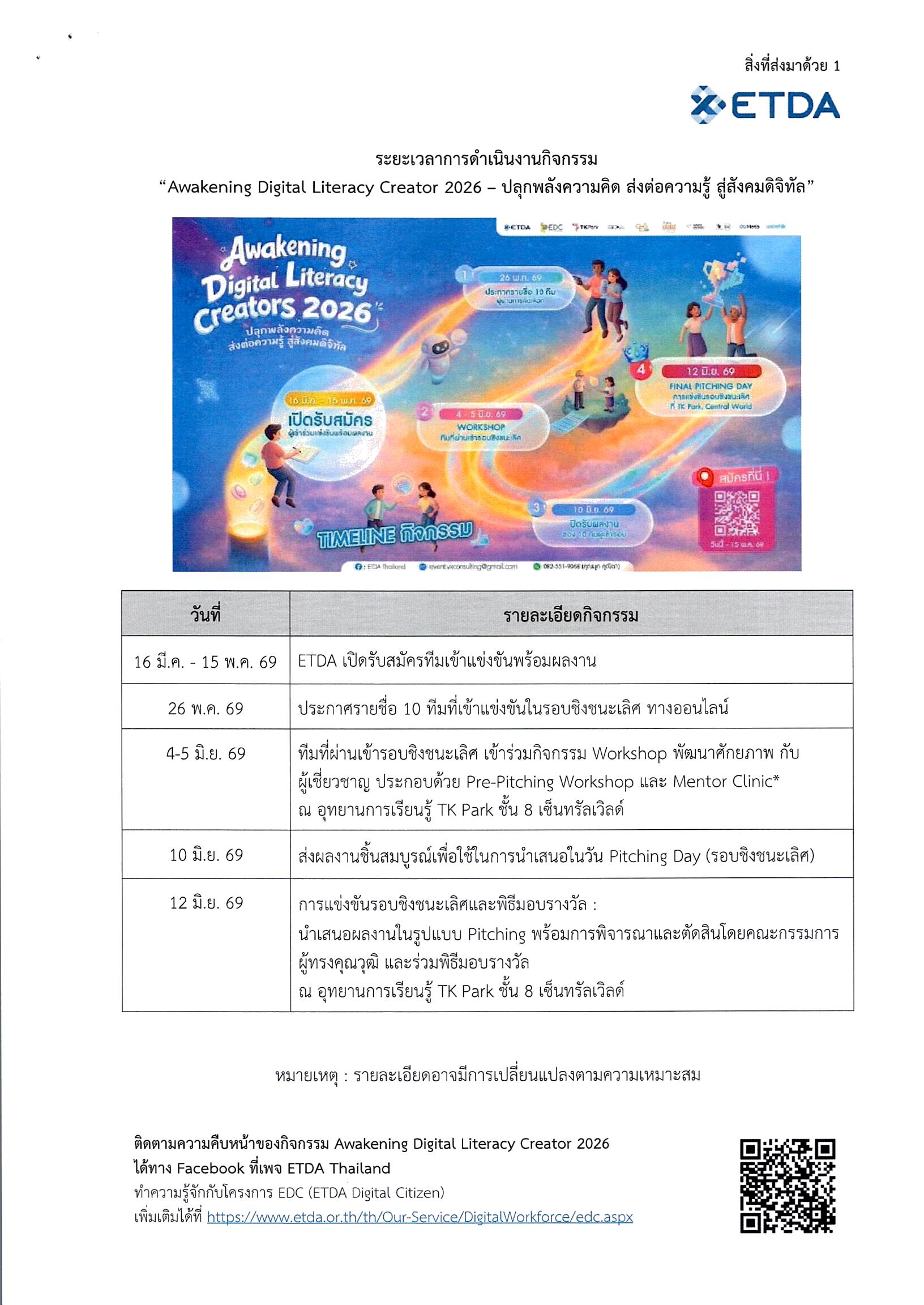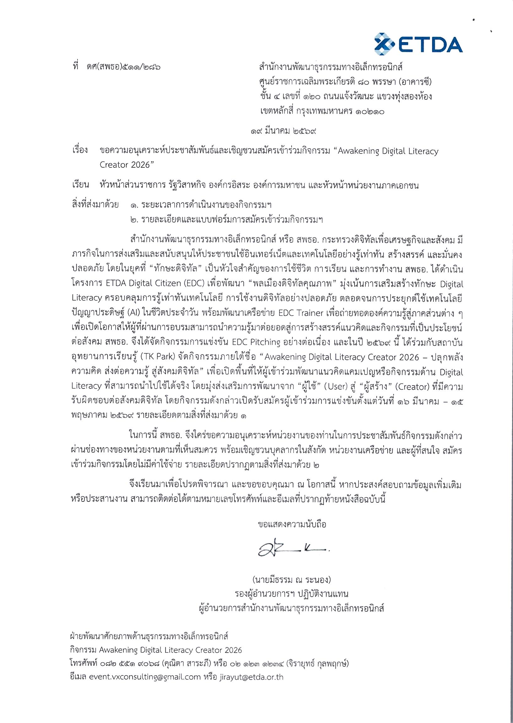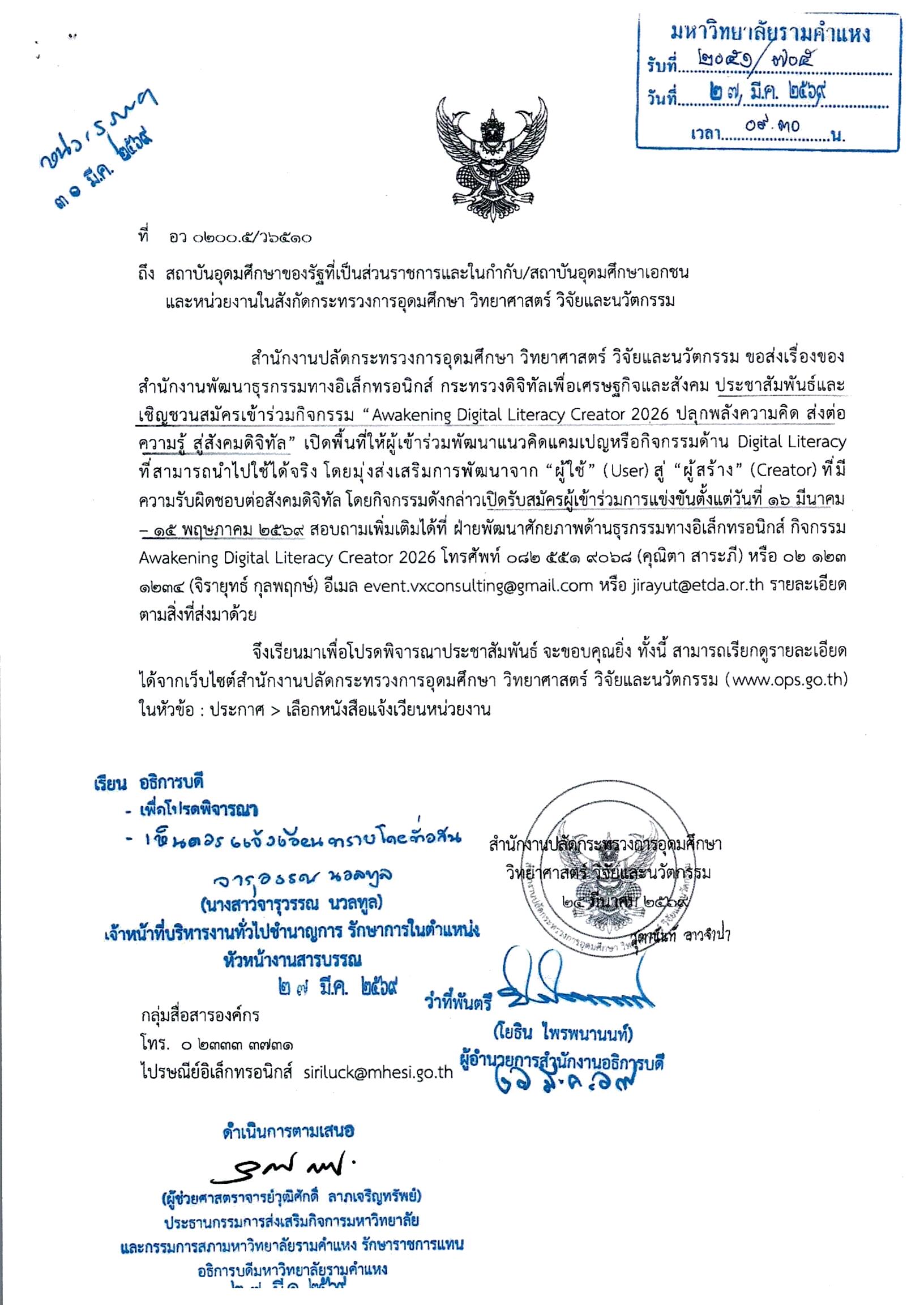ประชาสัมพันธ์และเชิญชวนสมัครเข้าร่วมกิจกรรม "Awakening Digital Literacy Creator 2026 ปลุกพลังความคิด ส่งต่อควารู้ สู่สังคมดิจิทัล