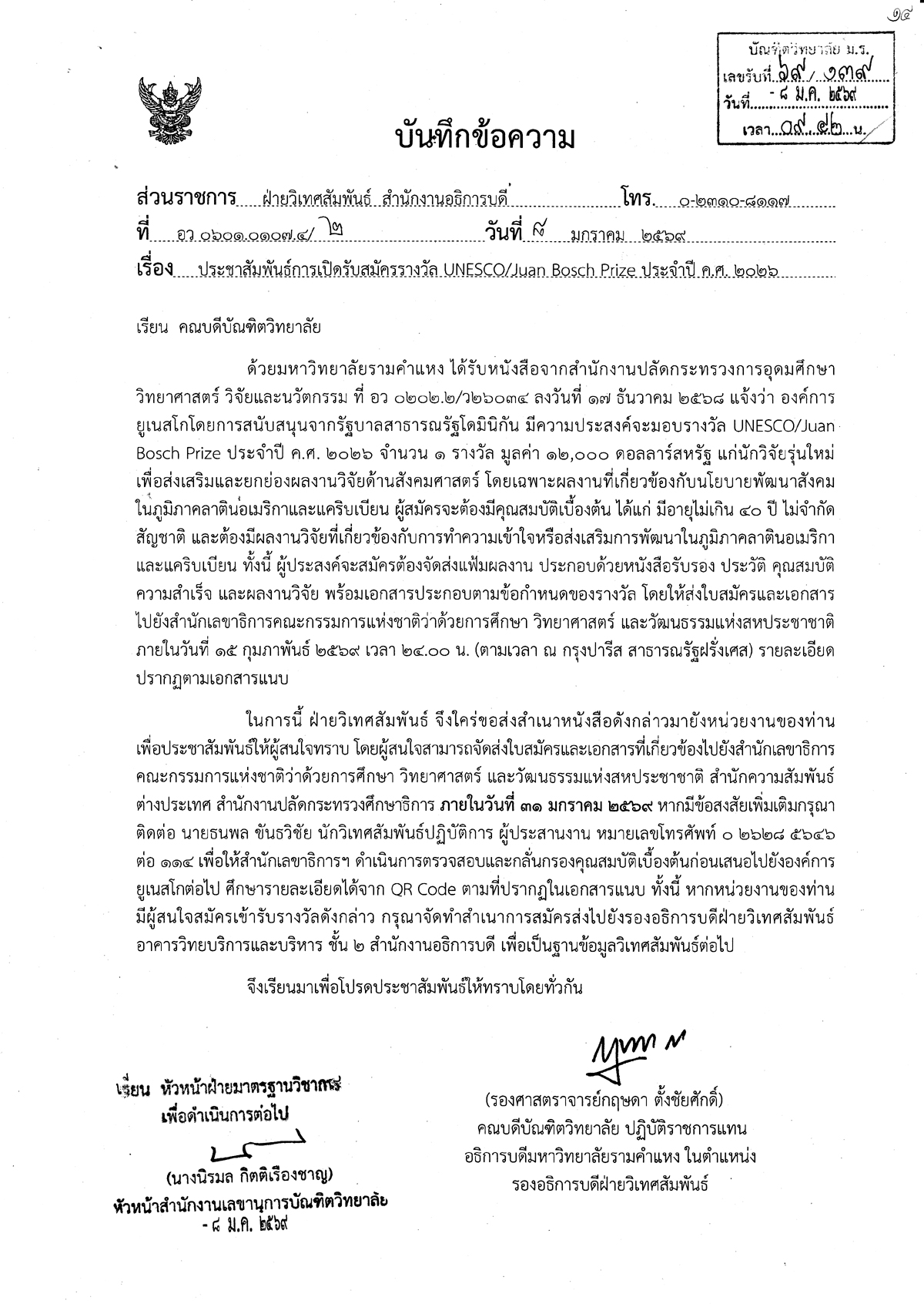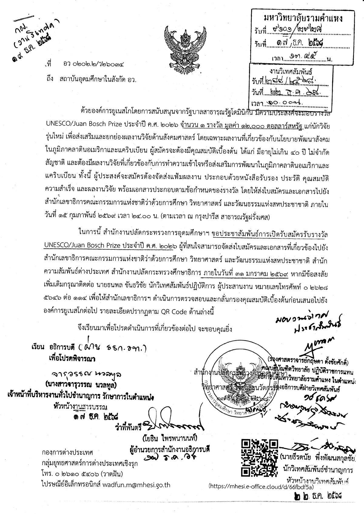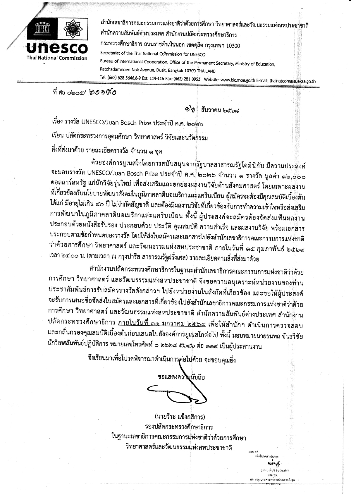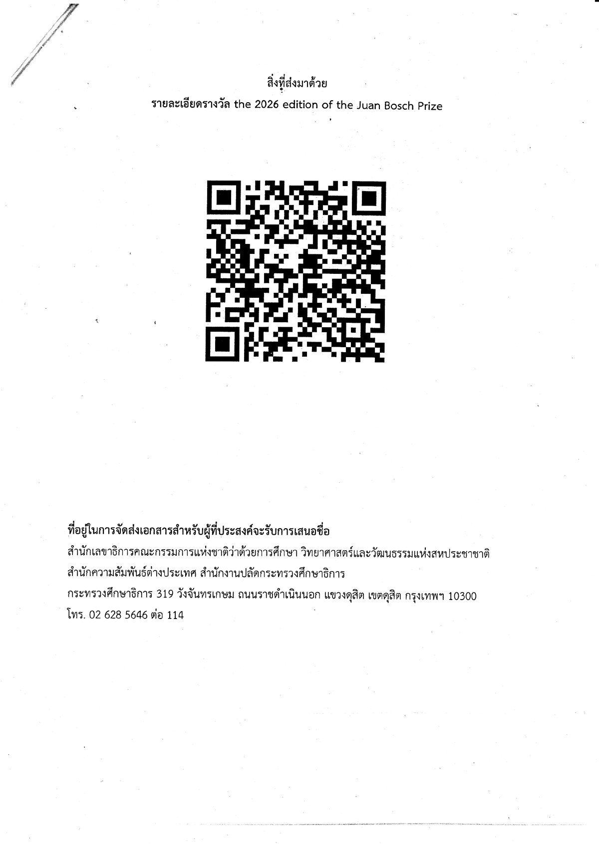 ประชาสัมพันธ์การเปิดรัสมัครรางวัล UNESCO/Juan Bosch Prize ประจำปี ค.ศ. 2026