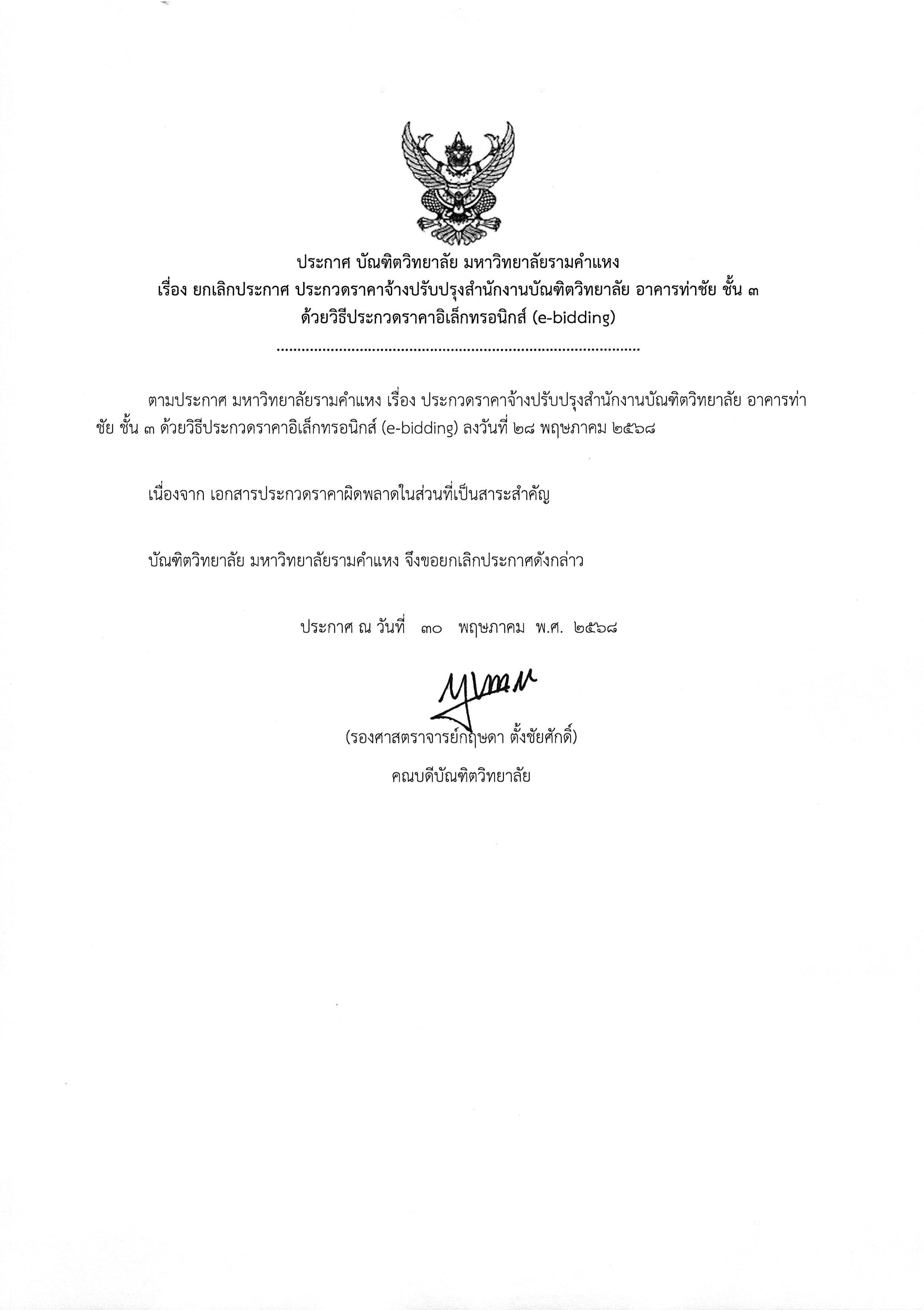 ประกาศยกเลิก ประกวดราคาจ้างปรับปรุงสำนักงานบัณฑิตวิทยาลัย อาคารท่าชัย ชั้น 3 ปี 2568