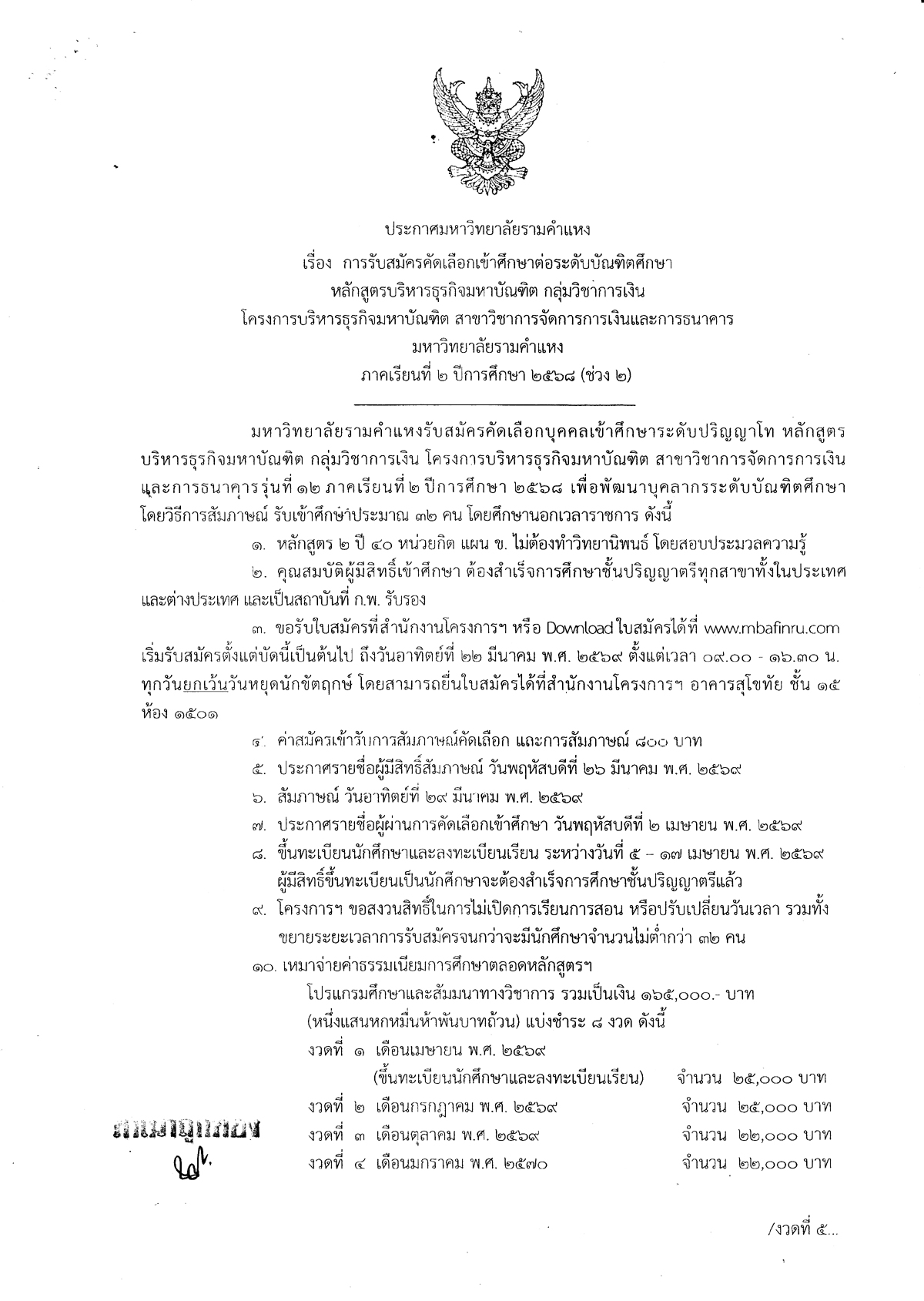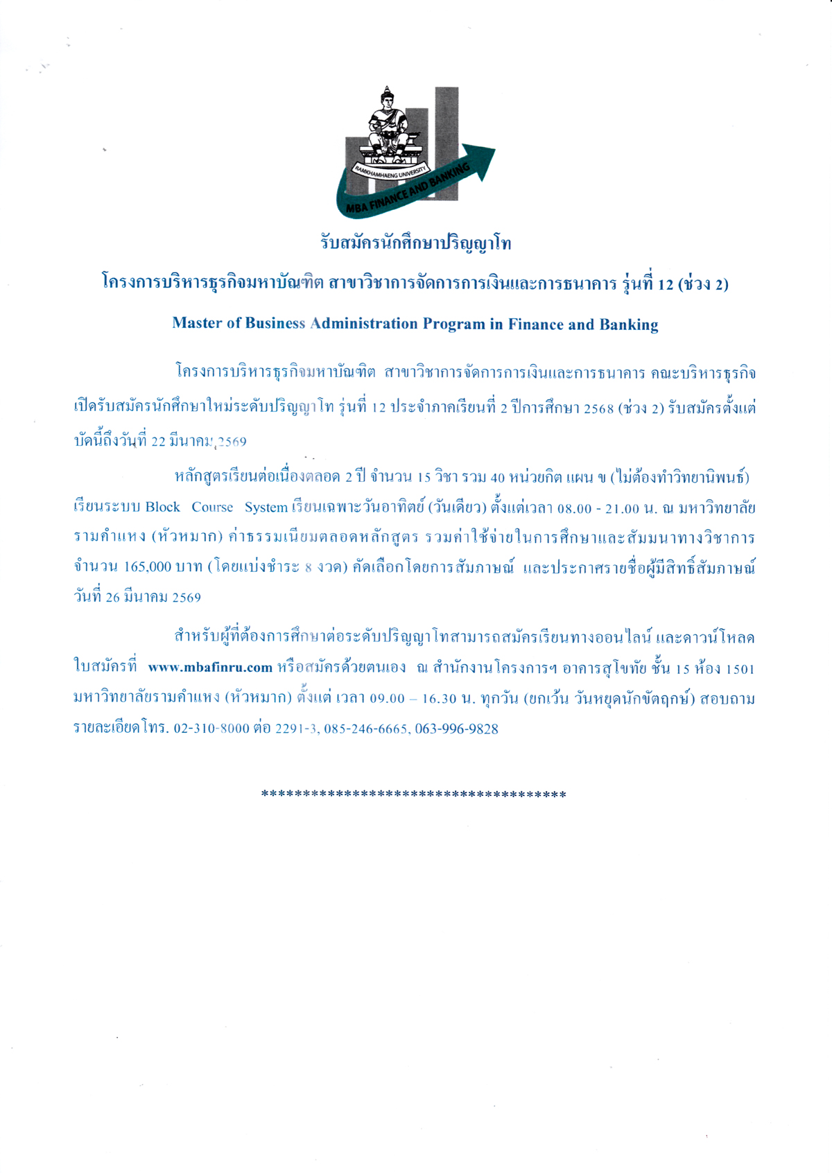 ประกาศรับสมัครนักศึกษาปริญญาโท โครงการบริหารธุรกิจมหาบัณฑิต สาขาวิชาการจัดการการเงินและการธนาคาร รุ่นที่ 12 (ช่วง 2)