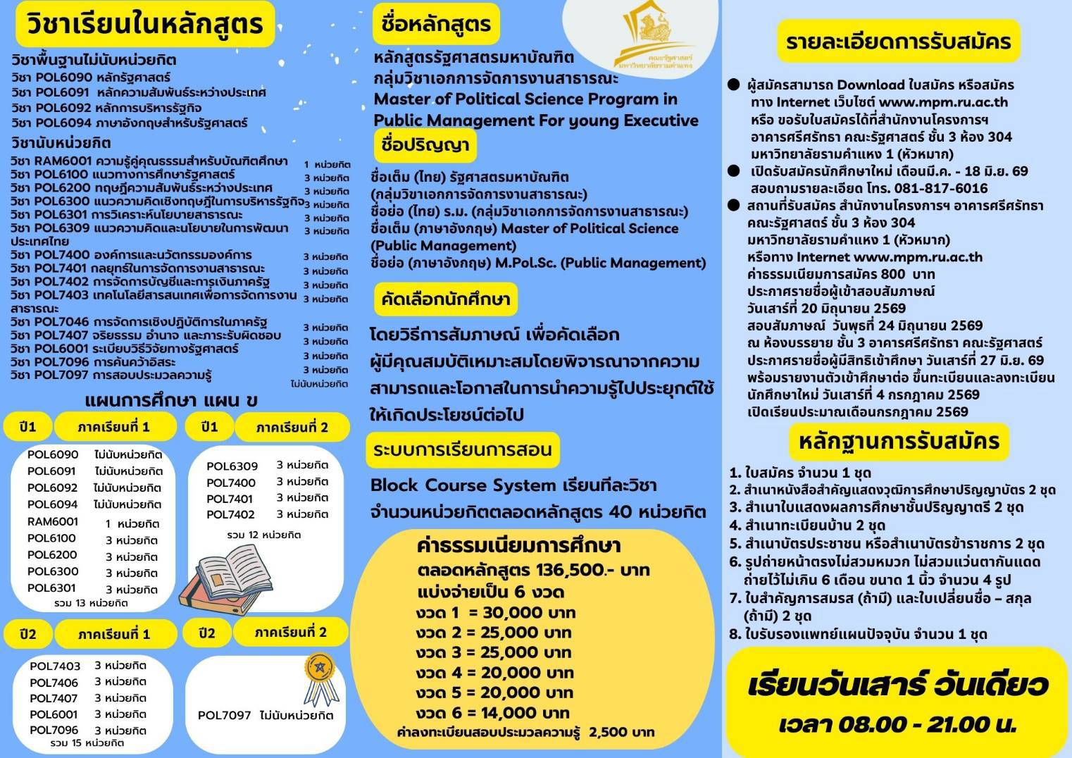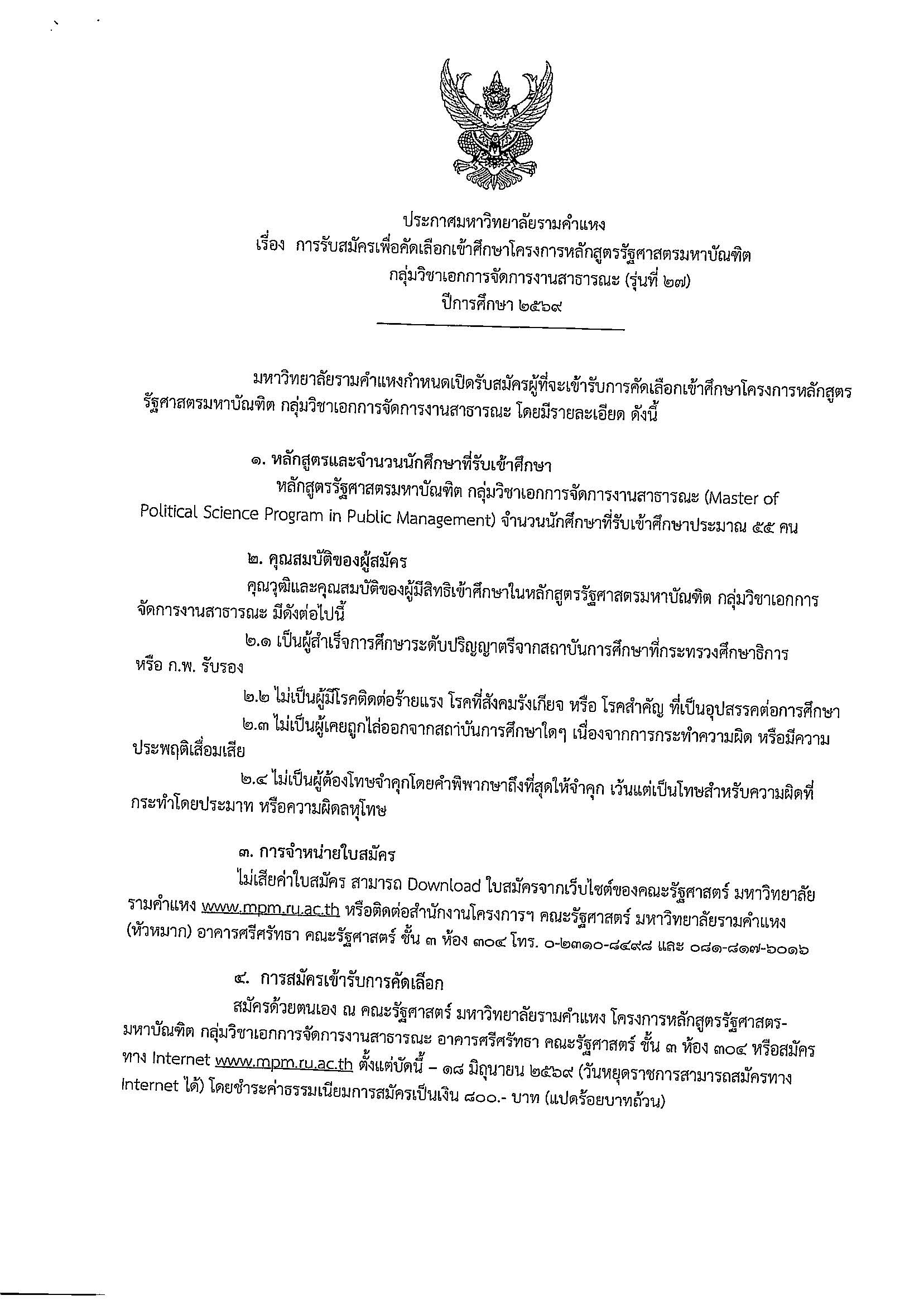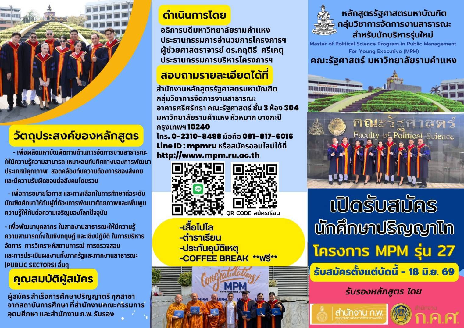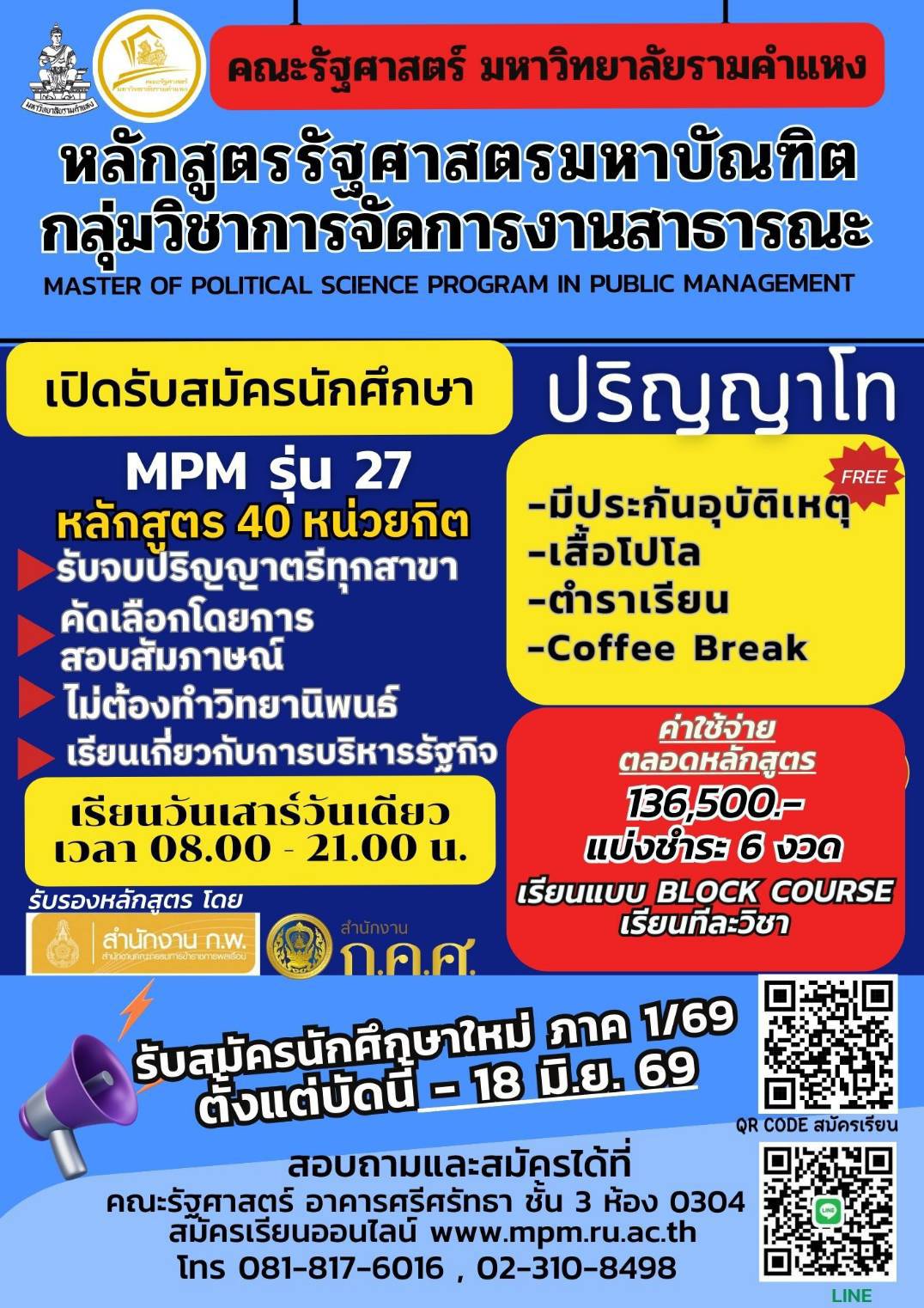 ประชาสัมพันธ์รับสมัครนักศึกษาใหม่ หลักสูตรรัฐศาสตรมหาบัณฑิต กลุ่มวิชาเอกการจัดการงานสาธารณะ (รุ่นที่ 27)
