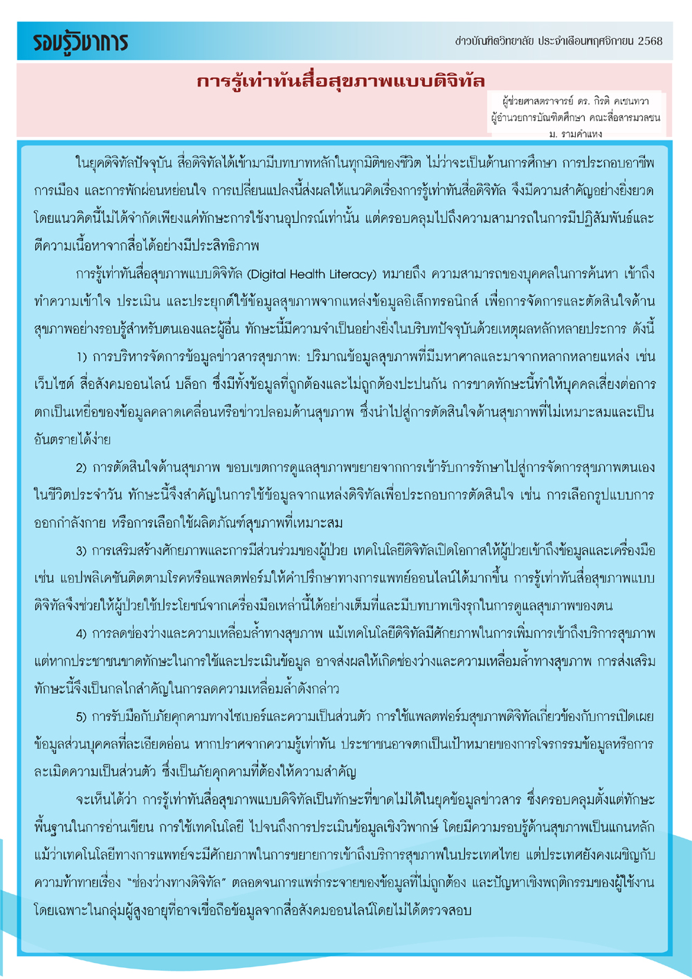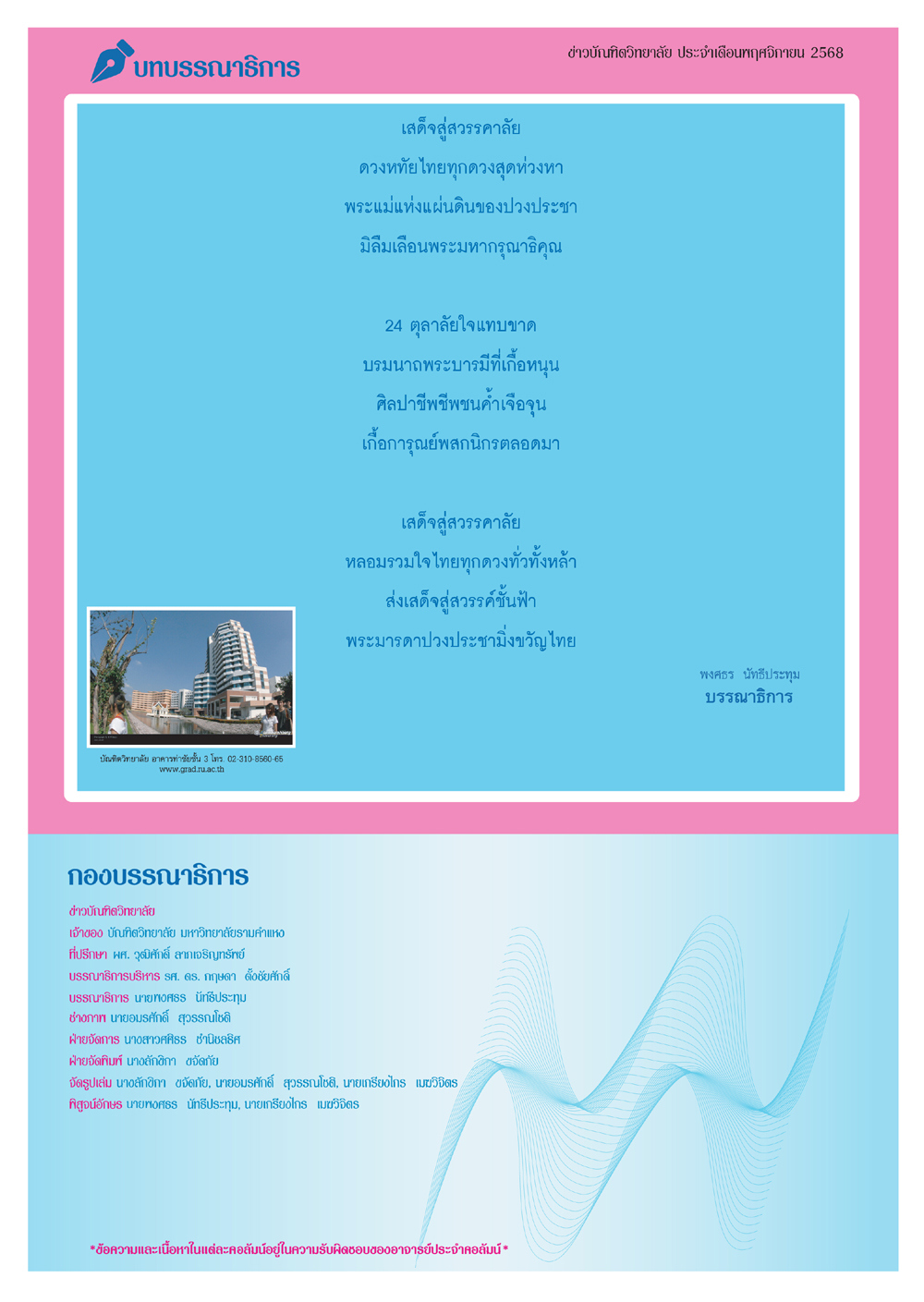 graduate ข่าวบัณฑิตวิทยาลัย 04 พฤศจิกายน 2568 ฮิต: 11 ข่าวบัณฑิตวิทยาลัย ปีที่ 12 ฉบับที่ 11 ประจำเดือน พฤศจิกายน 2568 ต่อไป