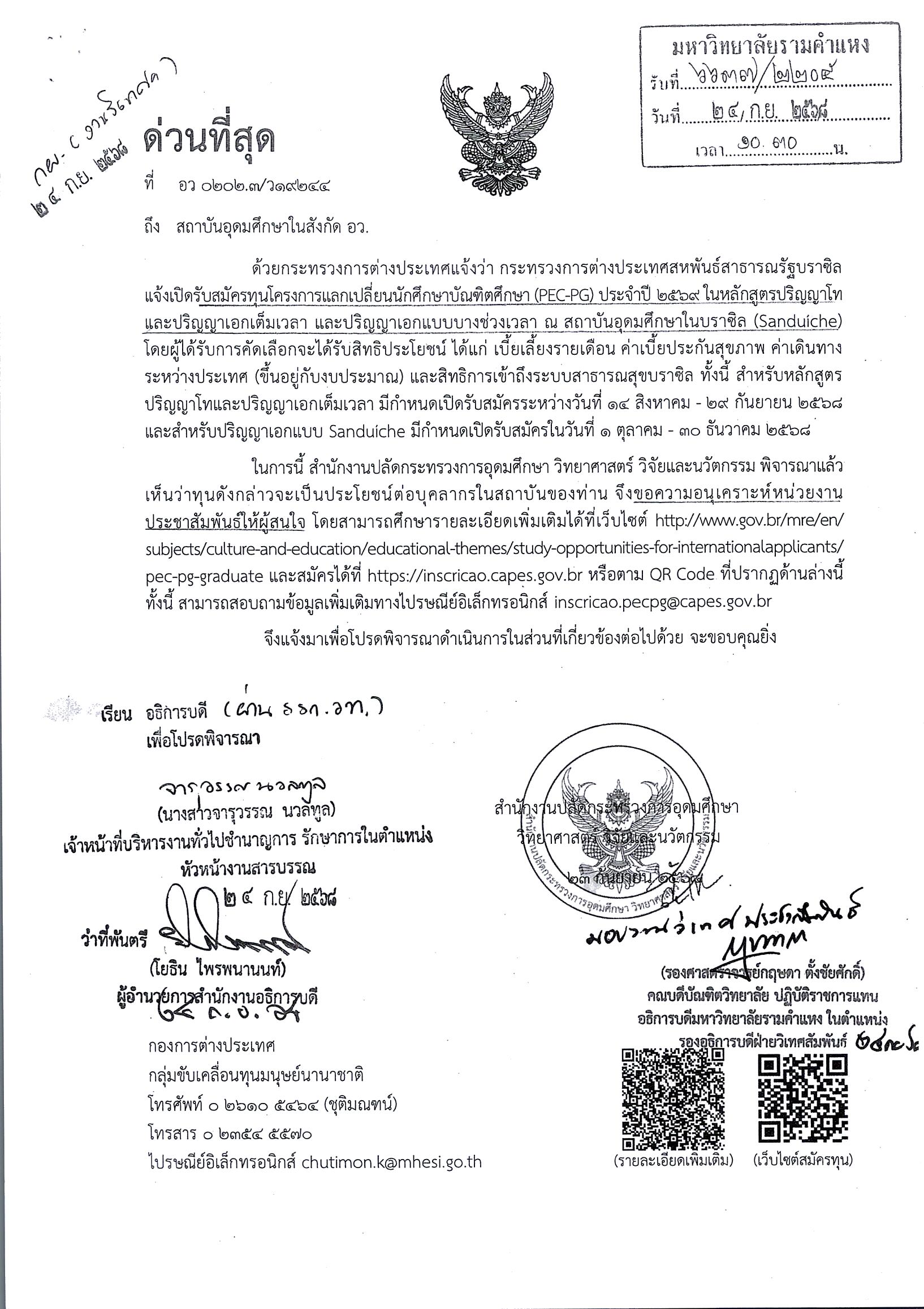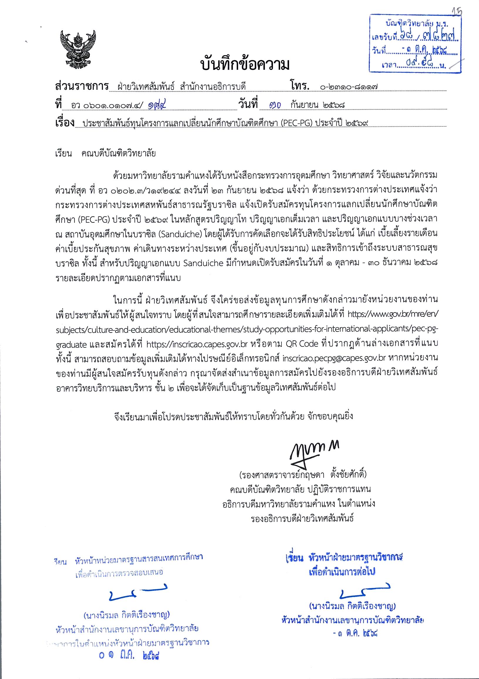 ZNAEM ประกาศข่าวประชาสัมพันธ์ 02 ตุลาคม 2568 ฮิต: 46 ประชาสัมพันธ์ทุนโครงการแลกเปลี่ยนนักศึกษาบัณฑิตศึกษา (PCE-PG) ประจำปี 2569 ก่อนหน้า ต่อไป