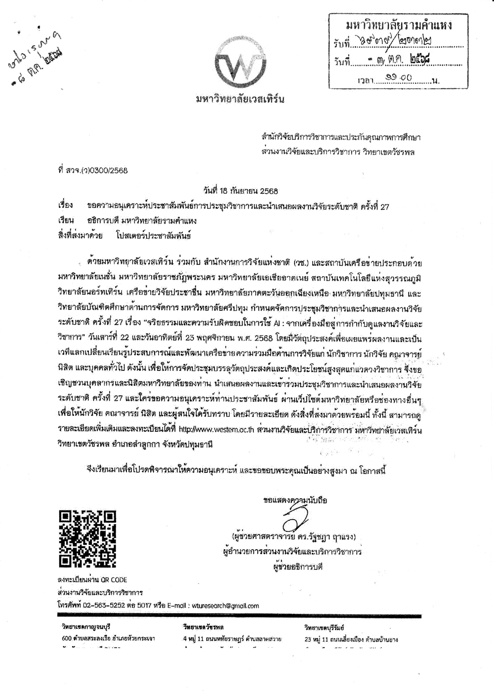 graduate ประกาศข่าวประชาสัมพันธ์ 10 ตุลาคม 2568 ฮิต: 31 มหาวิทยาลัยเวสเทิร์นประชาสัมพันธ์การประชุมวิชาการและนำเสนอผลงานวิจัยระดับชาติ ครั้งที่ 27 ต่อไป