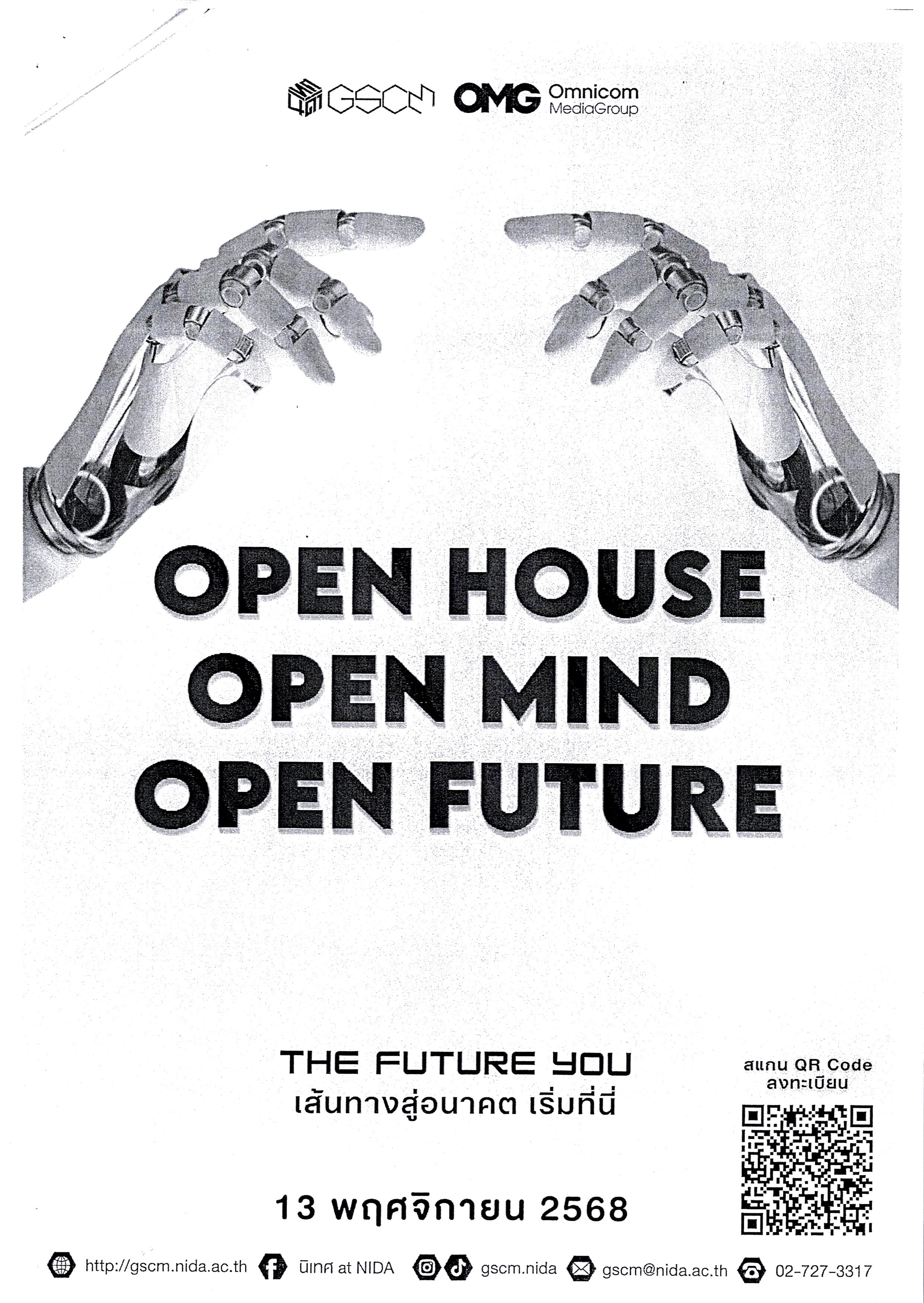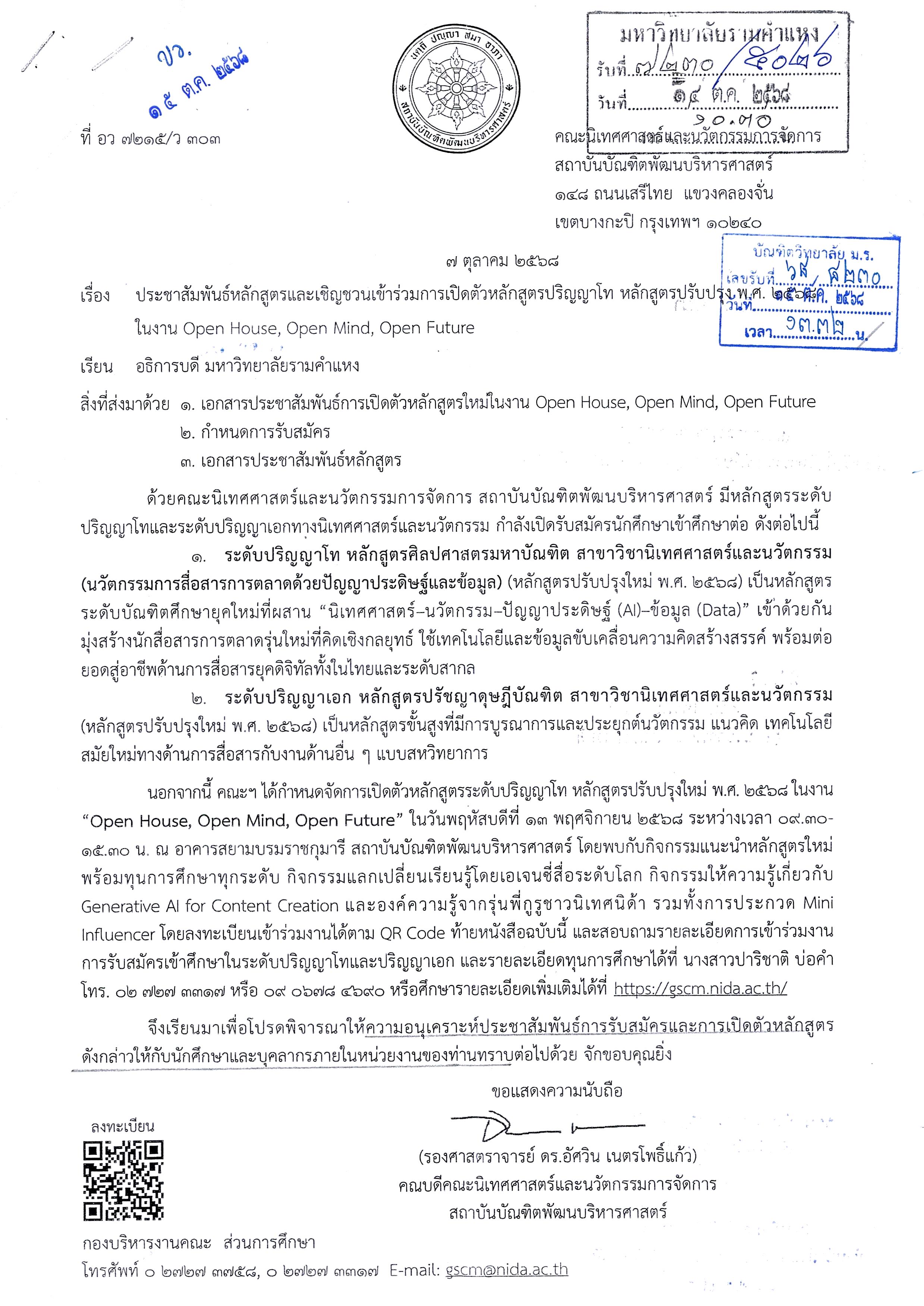 FIAT ประกาศข่าวประชาสัมพันธ์ 16 ตุลาคม 2568 ฮิต: 4 คณะนิเทศศาสตร์และนวัตกรรมการจัดการ สถาบันบัณฑิตพัฒนบริหารศาสตร์ ประชาสัมพันธ์หลักสูตรและเชิญชวนเข้าร่วมการเปิดตัวหลักสูตรปริญญาโทในงาน Open House, Open Mide, Open Future